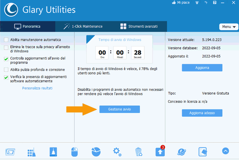 Glary Utilities include una cruscotto panoramico che consente di tenere traccia dell’orario di avvio di Windows, visualizza la versione e i dettagli della licenza, gestisce la manutenzione automatica, disabilita i programmi di avvio e di cancellare le tracce della privacy allo spegnimento.