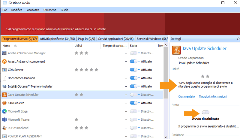 Possiamo esaminare la lista e disabilitare quelli che non sono necessari, cliccando sul pulsantino abilitato/disabilitato a fianco di ogni programma. Se non conosciamo bene di che programma si tratta, il consiglio è di lasciarlo attivato (come nel caso di antivirus, software updater ecc) sulla destra della schermata vedremo anche i consigli degli utenti che possono aiutarci nel decidere se disabilitare.