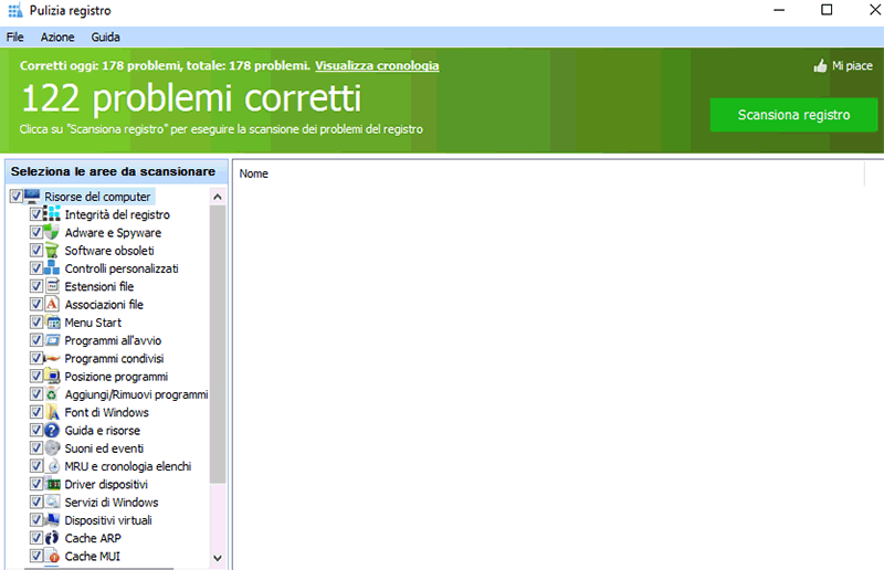 Cliccando sull’icona si parirà una schermata con tutti i problemi trovati nel file di registro di Windows, elemento importante ma spesso intasato da troppe voci vecchie che rallentano così il sistema, qui possiamo scegliere quali cose cancellare a mano oppure affidarci a Glary e ripulire tutto con un click del pulsante vedere ripara tutto in alto a destra.